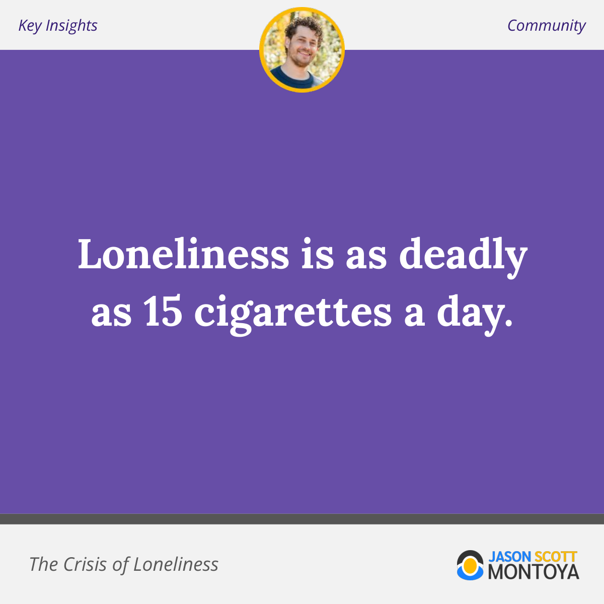 "Loneliness is being called a public health crisis in the U.S. Experts, including the U.S. Surgeon General and World Health Organizations, warn that loneliness carries health risks comparable to smoking 15 cigarettes a day. They are calling this a public health crisis of loneliness." - Jim Karwisch, Untangled Narrative