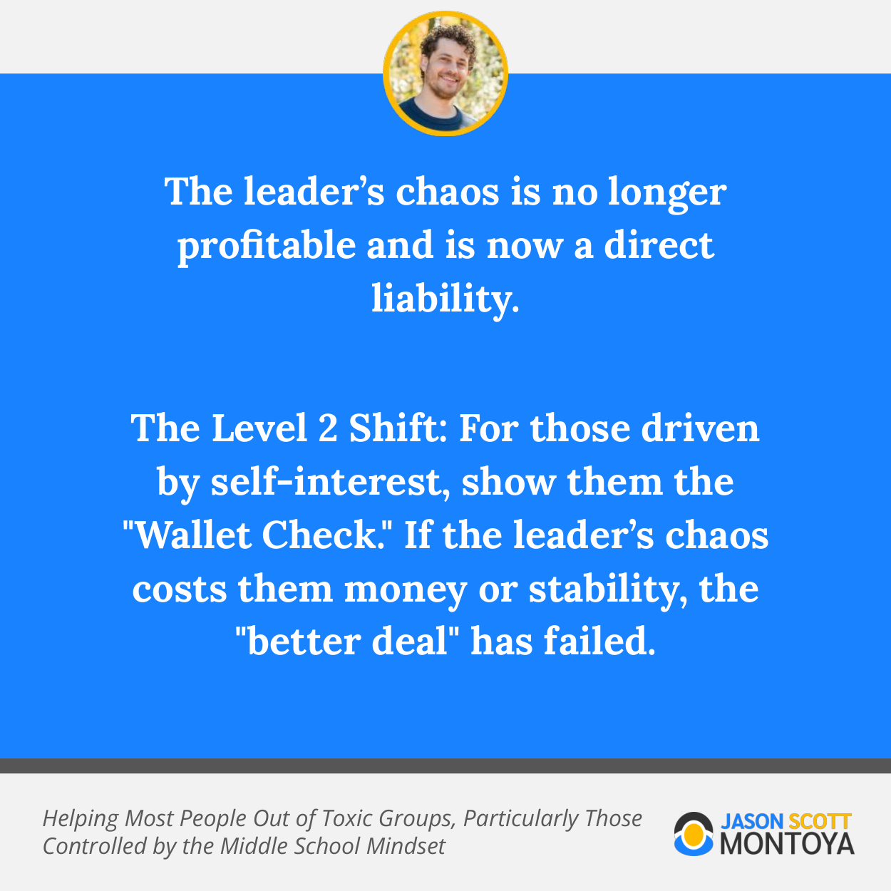 Logic: The individual is driven by avoiding immediate, direct costs (financial/physical threat). Show the leader's chaos is no longer profitable and is now a direct Level 2 liability.