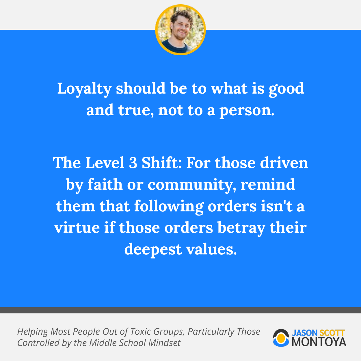 Acknowledge their legitimate values (e.g., "You are a patriot/good person/devout") and invite them to join a new, principled community (Level 4 thinkers) that shares those values but rejects the toxic leader.