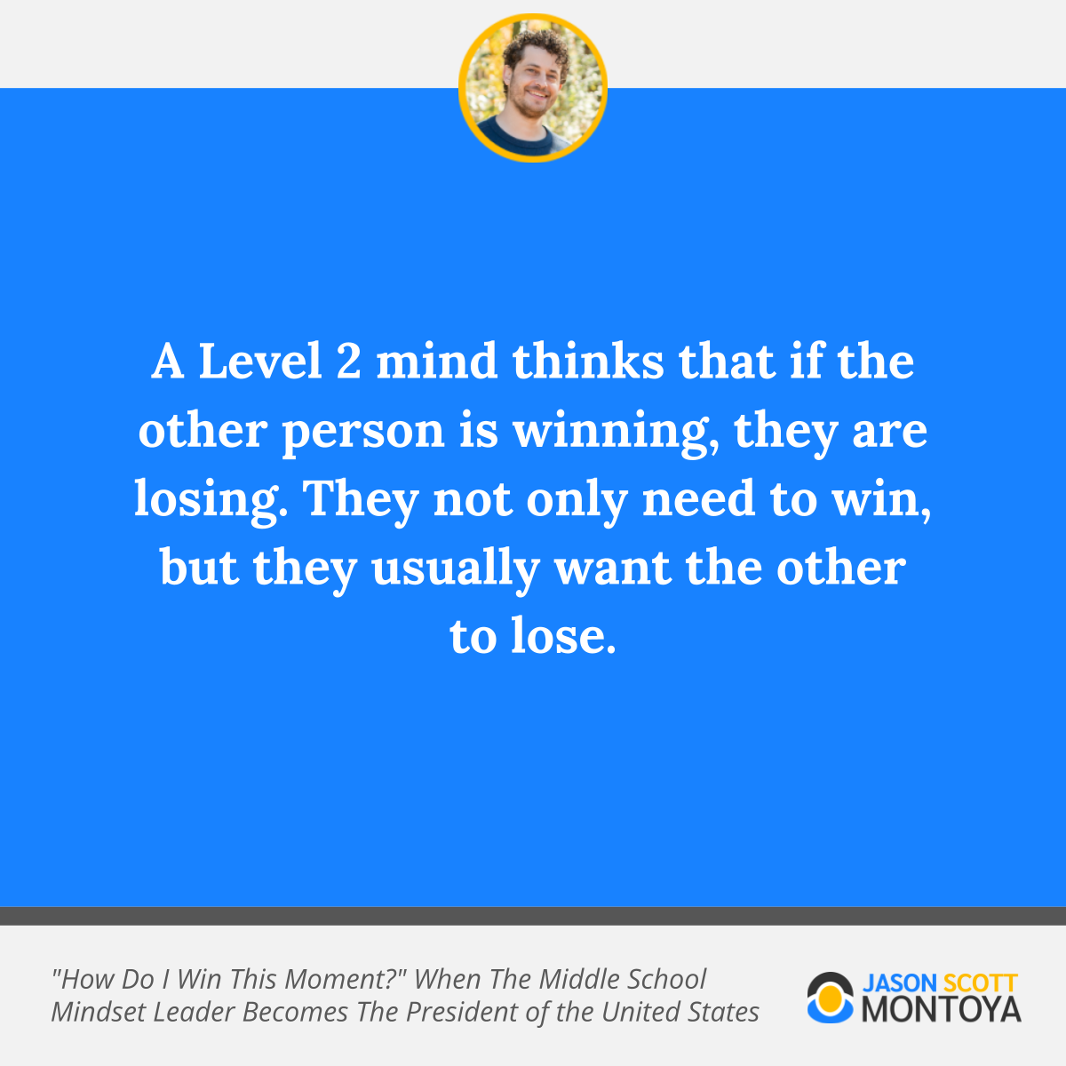 Winning and not losing is also a key dynamic here. A level 2 mind thinks that if the other person is winning, they are losing and being taken advantage of. As a result, they not only need to win, but they usually want the other to lose. This is the most satisfying type of win for them.