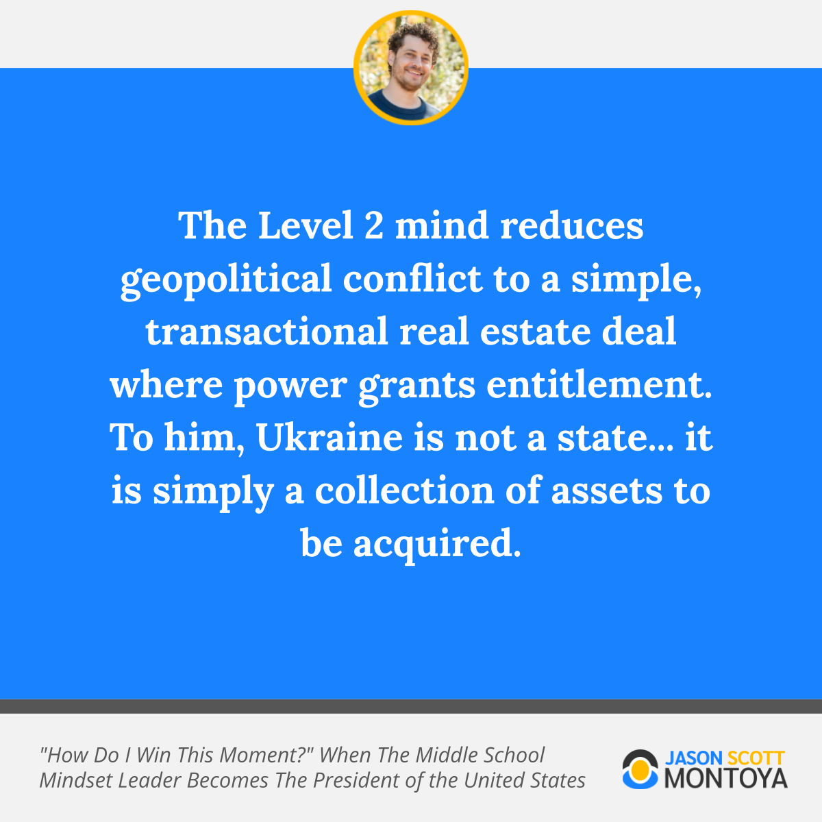 The World as Assets: In this view, Ukraine is not a state with borders and self-determination; it is simply a collection of assets that can be acquired. This allows the Level 2 mind to treat the invasion as morally neutral—just one party acquiring another party's holdings.