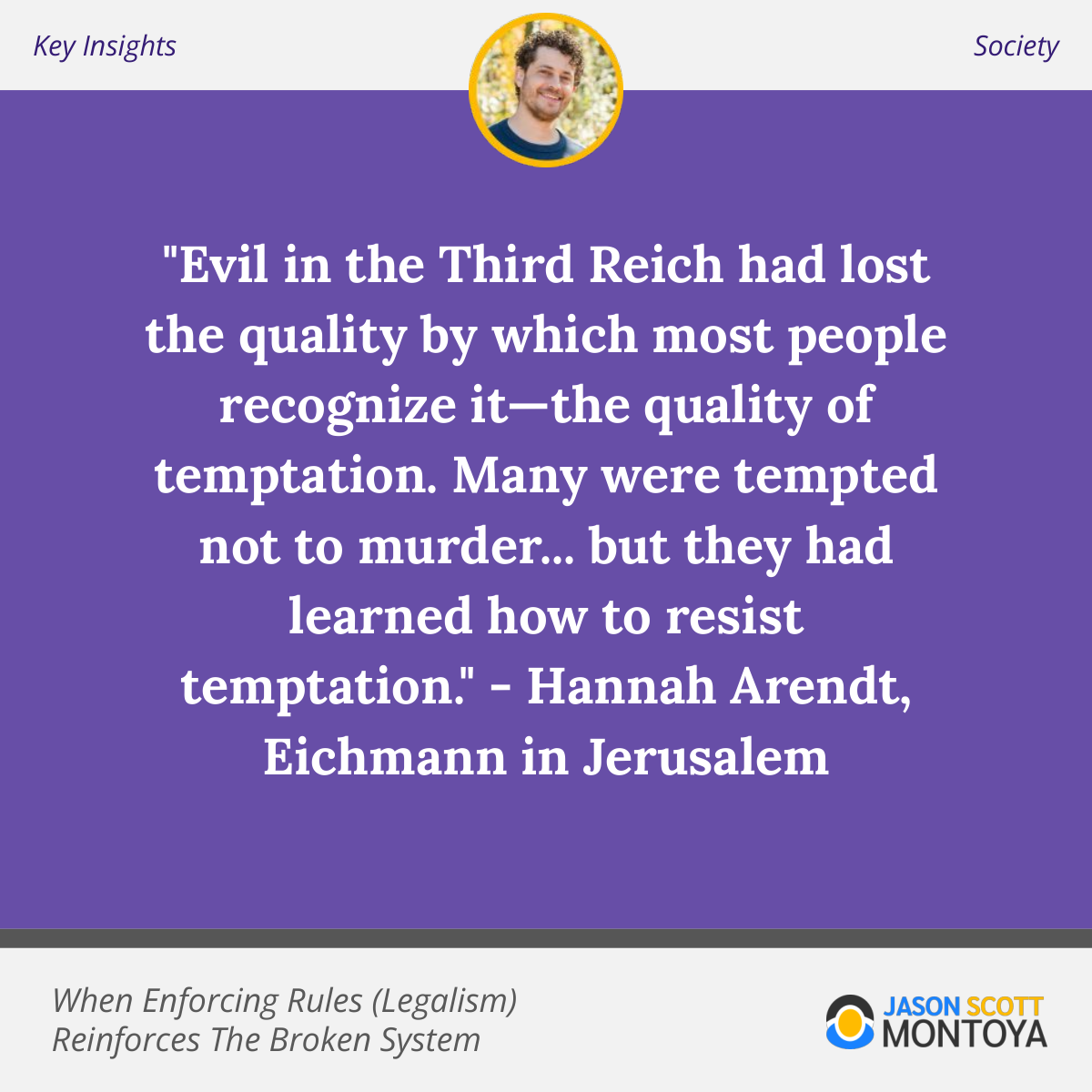 Eichmann represented the middle-tier manager "normal" person following the rules. In fact, he thought of himself as really good and efficient at his job. He was a great rule follower. He just happened to have a job that, by being good at it, led to the suffering and death of millions of people. But those were the rules of his society, and this dynamic is encapsulated in the following passage from Arendt.